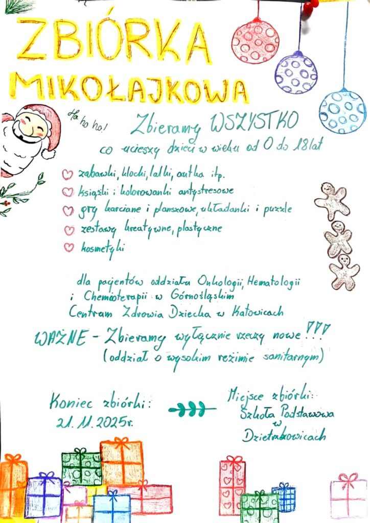 W piątek zakończyliśmy zbiórkę mikołajkowa dla oddziału onkologicznego . Dzięki Wam mamy trzy ogromne kartony darów, które ucieszą małych pacjentów 🎁🎁🎁 dziękujemy 🥰 podziękowanie należy się też klasie ósmej , która pakowała dary oraz radzie rodziców, dzięki której te dary wyrusza w drogę 🥰